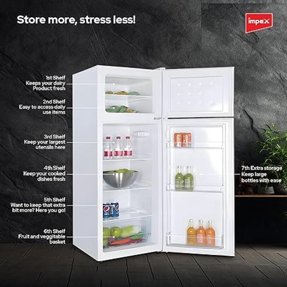 امبيكس ثلاجة بباب مزدوج 230 لتر 7.27 قدم مكعب تبريد سريع كفاءة في استخدام الطاقة وصامتة منتج لمدة عامين وضمان ضاغط 5 سنوات -IRF 220 ابيض