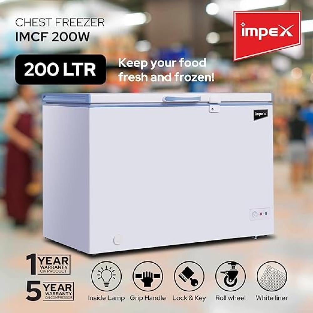 مجمد أفقي بقدرة 80 واط وسعة 200 لتر ونظام تبريد موفر للطاقة، مجمد بفتحة علوية مزود بمصباح وقفل ومفتاح من امبيكس، مناسب للمنازل والمطاعم، IMCF 200A
