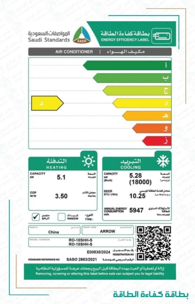 مكيف اسبليت , مقاس 18 , ماركة ارو , 18000 وحده , RO-18SHH-S